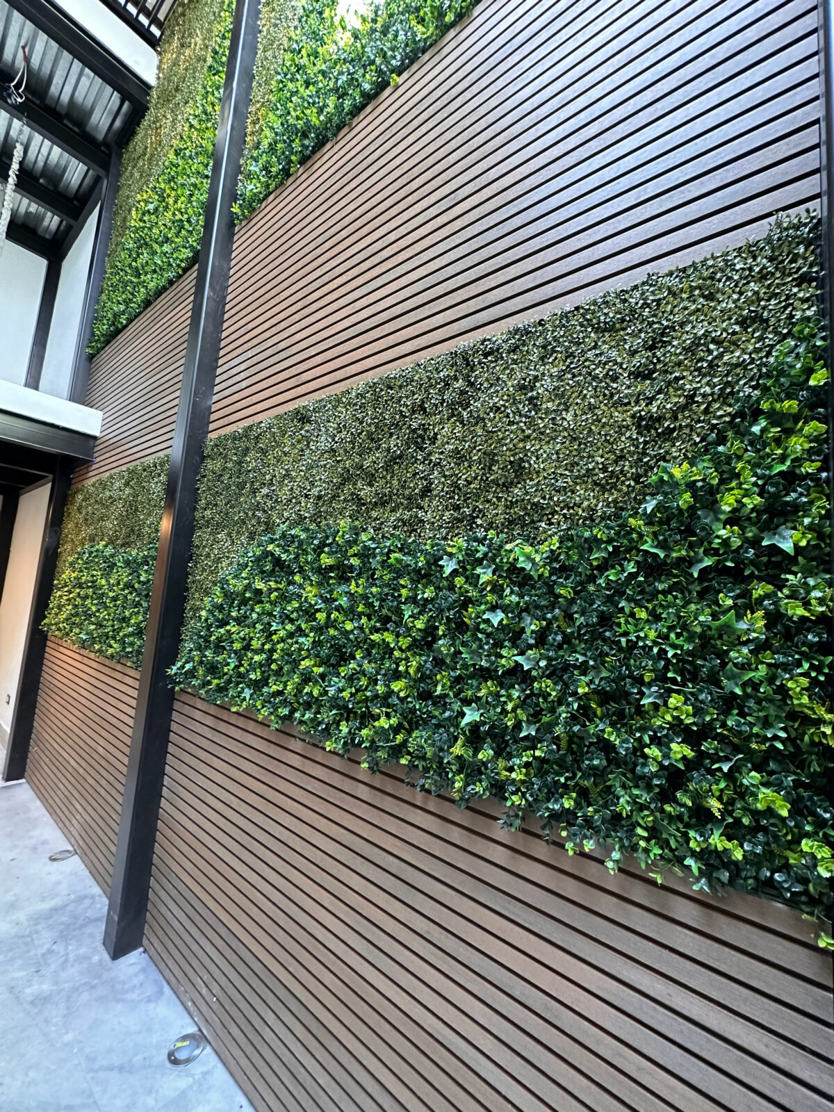El follaje artificial es un revestimiento decorativo, para interiores y exteriores, hecho de materiales sintéticos como plástico o polietileno (HDPE). Se utiliza para imitar el follaje natural, ofreciendo una alternativa de bajo mantenimiento que no requiere agua ni poda, y mantiene su color durante todo el año al no necesitar luz solar. Suelen fabricarse en paneles o mallas con ramas y hojas que se insertan manualmente, ofreciendo una solución fácil y duradera para decorar paredes, crear muros verdes o dividir espacios.